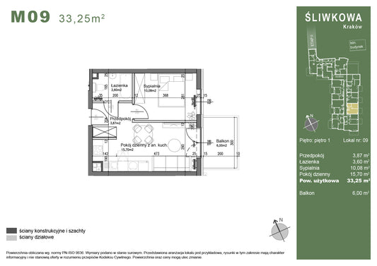 Mieszkanie M09 (33,25 m²) Funkcjonalne mieszkanie jednopokojowe z własnym balkonem, oferujące wszystko, czego potrzeba do wygodnego życia na niewielkiej przestrzeni.