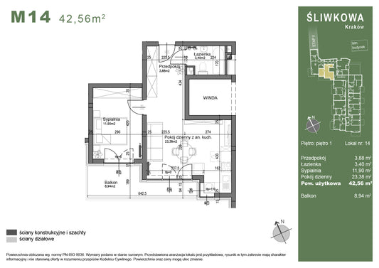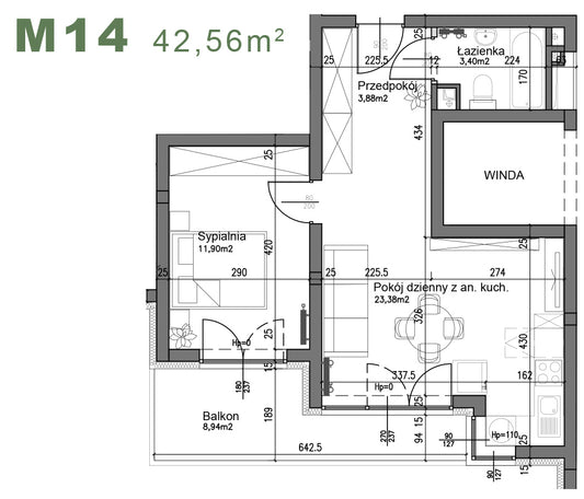 Mieszkanie M14 (42,56 m²) Kompaktowe mieszkanie dwupokojowe z balkonem, łączące funkcjonalność z wygodą codziennego użytkowania.