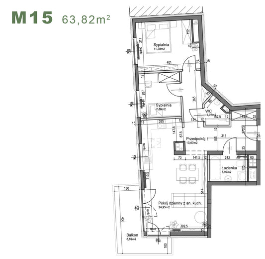 Mieszkanie M15 (63,82 m²) Przestronne mieszkanie trzypokojowe z balkonem, oferujące wygodną przestrzeń dla rodziny oraz możliwość elastycznej aranżacji wnętrz.