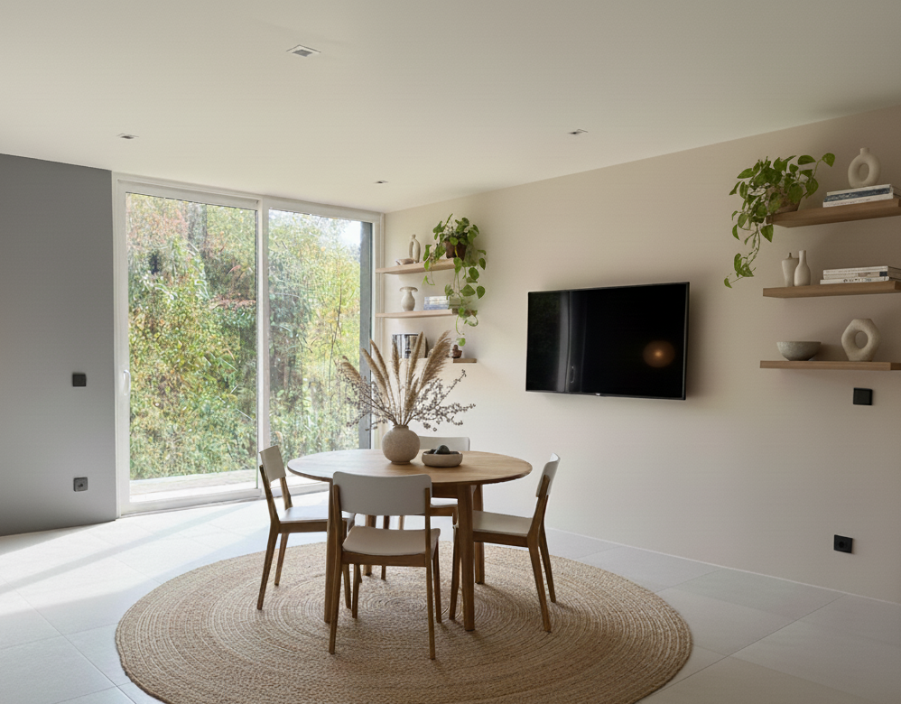 Przemyślany układ pomieszczeń zapewnia maksymalny komfort użytkowania. Centralnym punktem mieszkania jest przestronny salon z aneksem kuchennym o powierzchni 28,57 m². Duże przeszklenia oraz bezpośrednie wyjście na ogródek sprawiają, że wnętrze jest jasne i doskonale doświetlone naturalnym światłem. Prywatną strefę mieszkania stanowi sypialnia o powierzchni 10,41 m², zapewniająca spokojny odpoczynek.