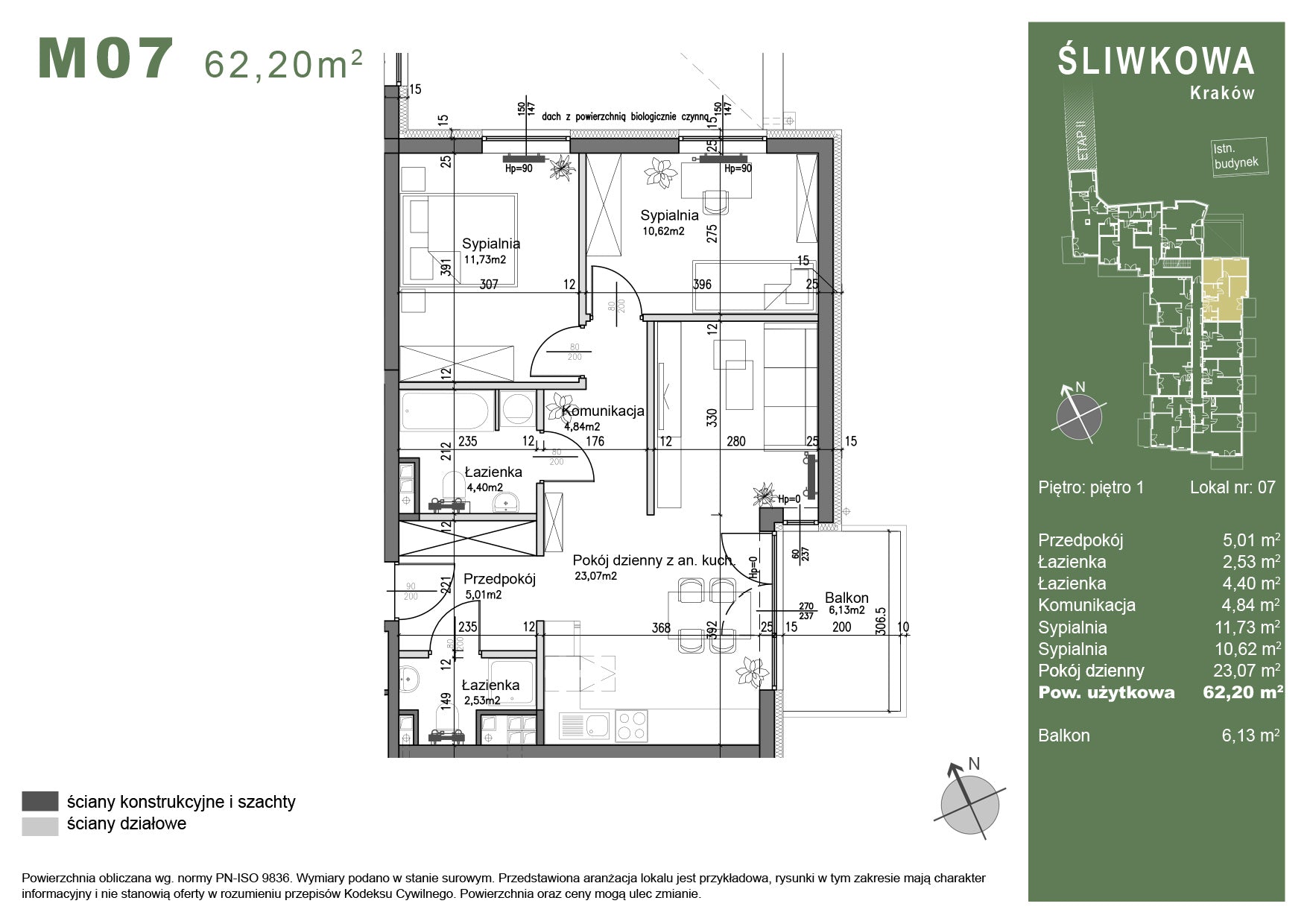 Prezentujemy Państwu wyjątkowe mieszkanie M07 o powierzchni 62,20 m², zlokalizowane na pierwszym piętrze nowoczesnego budynku przy ulicy Śliwkowej w Krakowie. To przestronne trzypokojowe mieszkanie zostało zaprojektowane z myślą o rodzinach ceniących komfort i funkcjonalność.