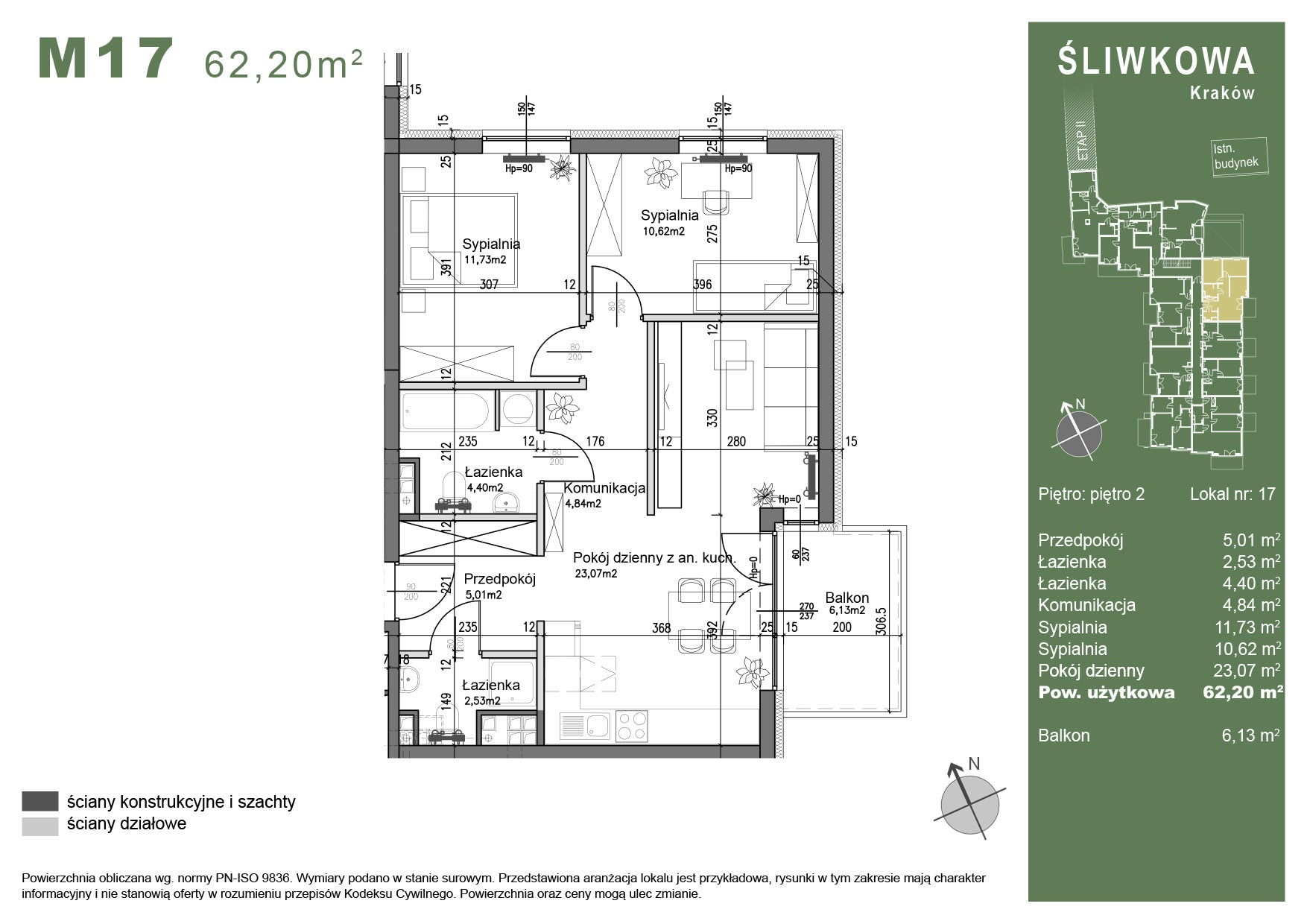 Prezentujemy Państwu wyjątkowe mieszkanie M17 o powierzchni 62,20 m², zlokalizowane na drugim piętrze nowoczesnego budynku przy ulicy Śliwkowej w Krakowie. To przestronne trzypokojowe mieszkanie zostało zaprojektowane z myślą o rodzinach ceniących komfort i funkcjonalność.