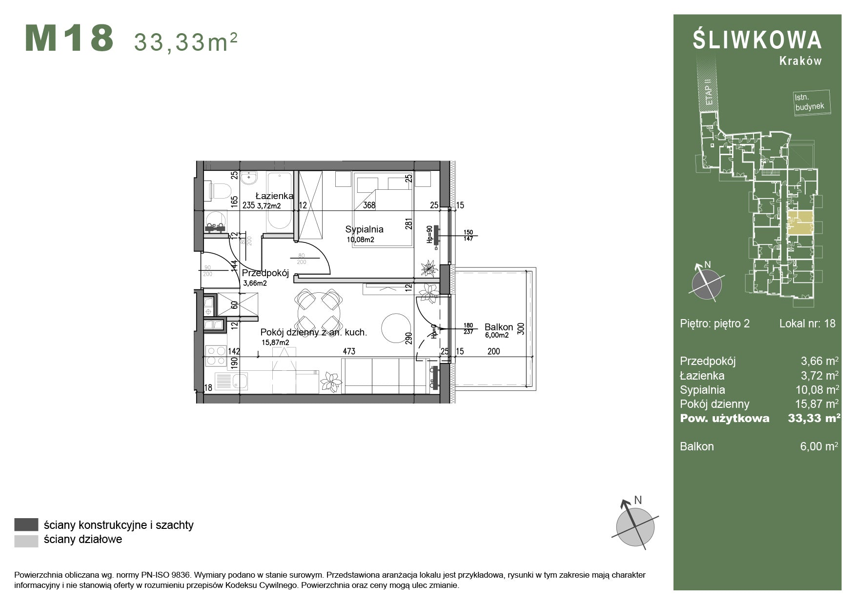 Prezentujemy Państwu kompaktowe mieszkanie M18 o powierzchni 33,33 m², zlokalizowane na drugim piętrze nowoczesnego budynku przy ulicy Śliwkowej w Krakowie. To funkcjonalne dwupokojowe mieszkanie zostało zaprojektowane z myślą o osobach ceniących przemyślane rozwiązania na niewielkiej przestrzeni.