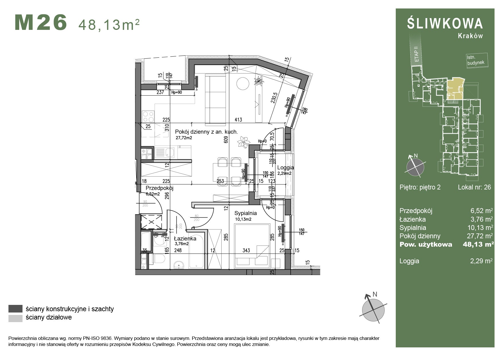 Prezentujemy Państwu funkcjonalne mieszkanie M26 o powierzchni 48,13 m², zlokalizowane na drugim piętrze nowoczesnego budynku przy ulicy Śliwkowej w Krakowie. To praktyczne dwupokojowe mieszkanie zostało zaprojektowane z myślą o osobach ceniących przestrzeń i ergonomiczne rozwiązania.