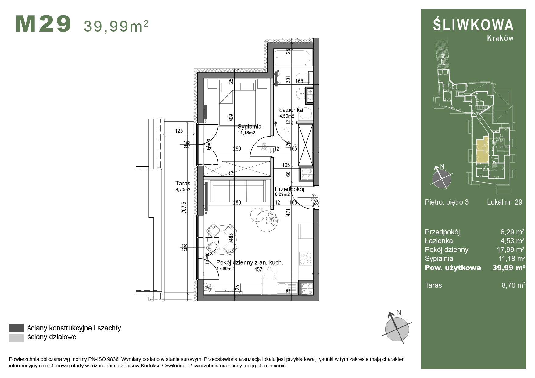 Prezentujemy Państwu funkcjonalne mieszkanie M29 o powierzchni 39,99 m², zlokalizowane na trzecim piętrze nowoczesnego budynku przy ulicy Śliwkowej w Krakowie. To praktyczne dwupokojowe mieszkanie zostało zaprojektowane z myślą o osobach ceniących optymalnie wykorzystaną przestrzeń oraz atrakcyjną lokalizację.